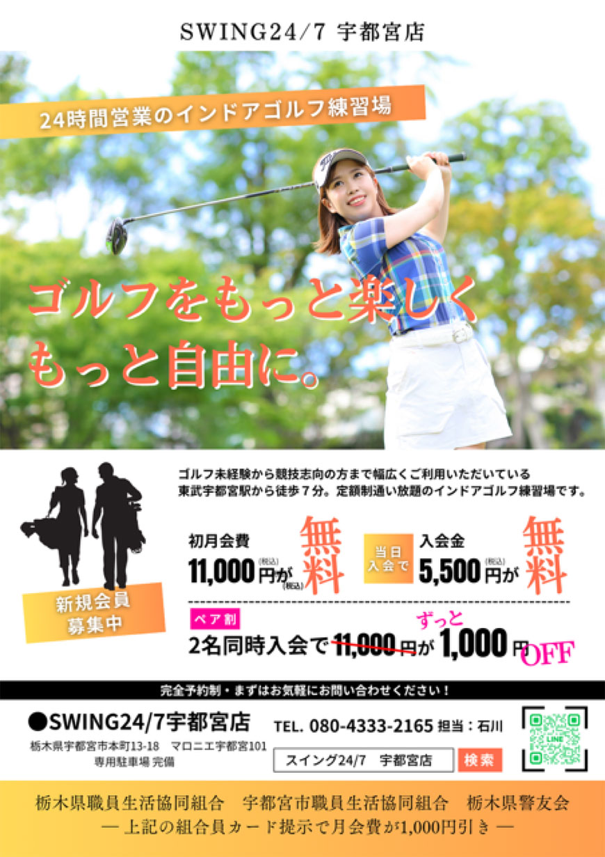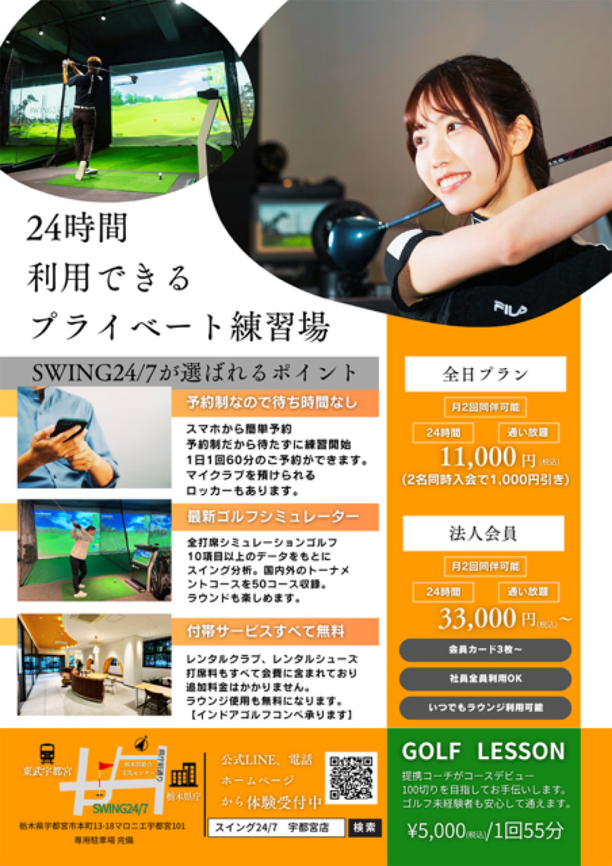 室内シュミレーションゴルフ練習場「SWING24/7宇都宮店」今ならお得な入会キャンペーン実施中。