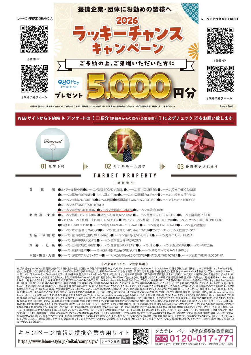 タカラレーベン【レーベン元今泉 MID FRONT】・【レーベン宇都宮 GRANDIA】 来場予約キャンペーンのご案内